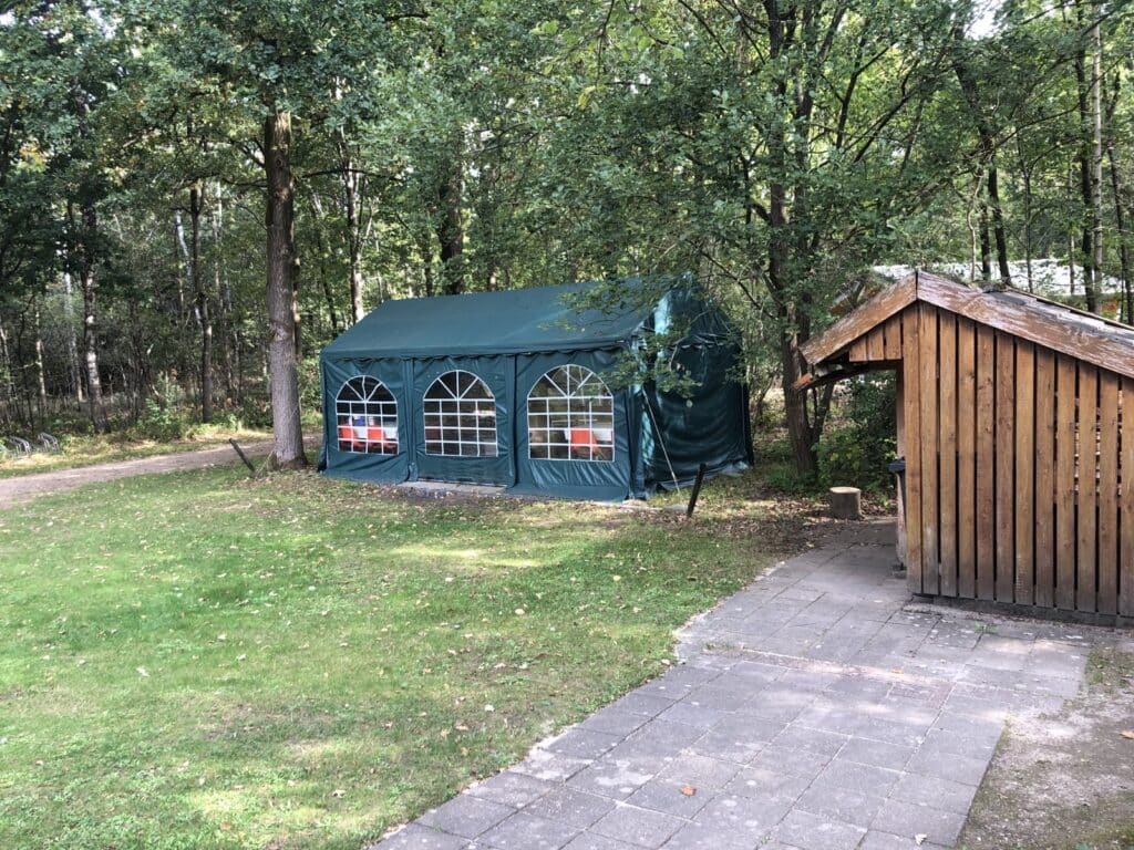 De buitenkeuken-tent wordt gebouwd. Hierin kunnen nu de kampeerders en daggasten eten koken en eten. Het was een lang gekoesterde wens, omdat we de keuken in de Menkhorst alleen willen gebruiken voor evenementen.